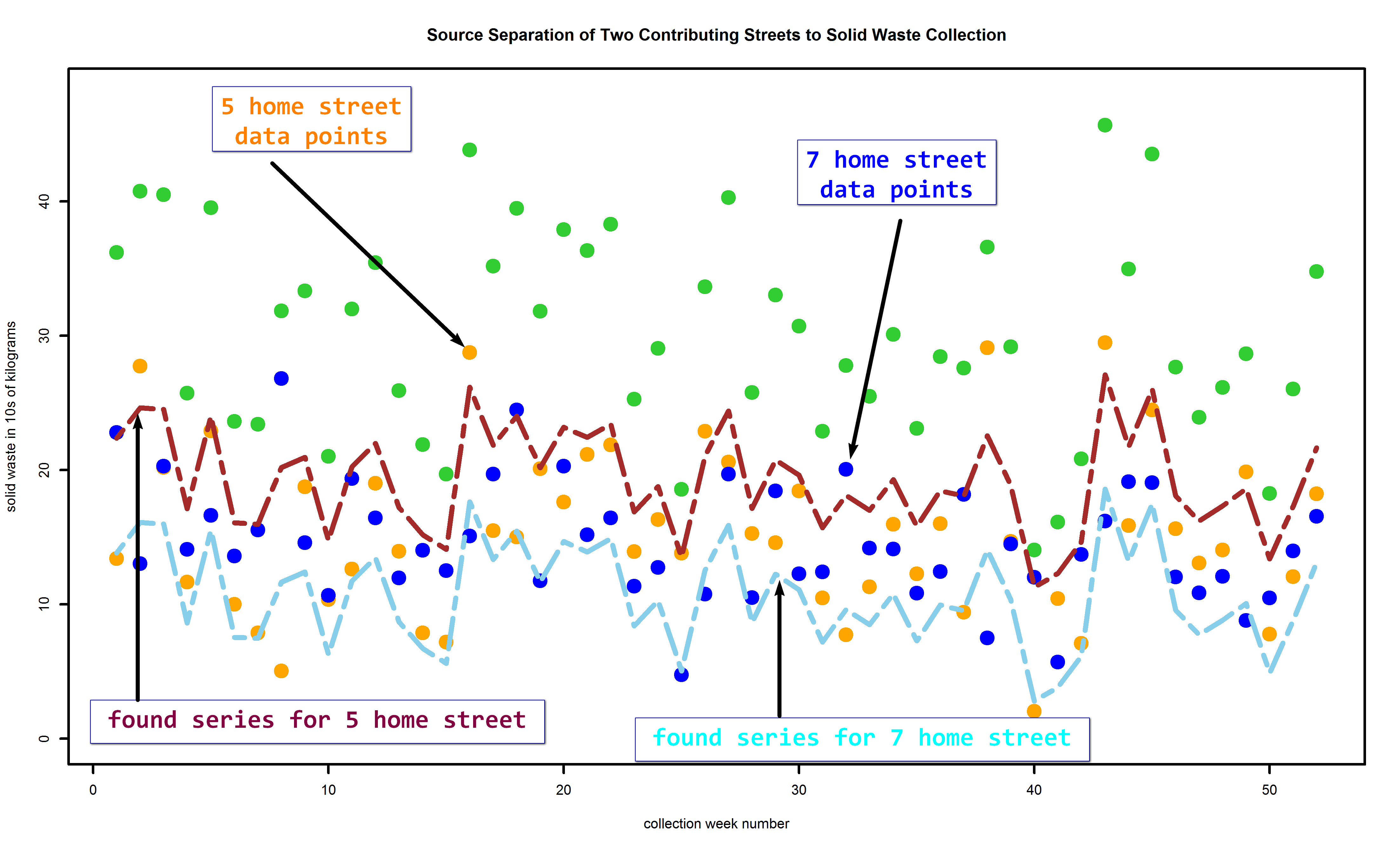 The point is to find out which street should receive more educational materials and tutoring regarding solid waste reduction. Detailed predictions by week aren’t really needed for that. All that’s really needed are estimates of the overall means for each street separately. The algorithm finds that, but the week by week breakouts are a bonus.